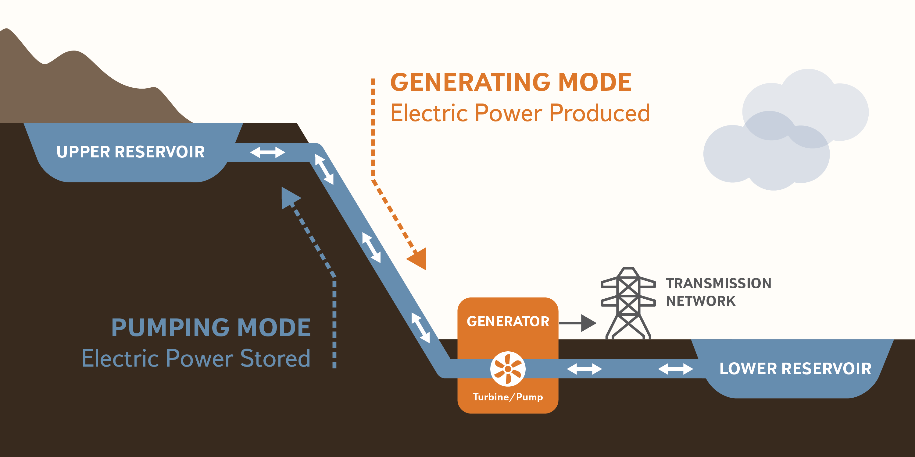 Pumped storage facilities rely on gravity to produce energy. The system moves water between a lower reservoir and an upper reservoir. When energy on the grid is plentiful, this excess energy is used to pump water from the lower reservoir to the upper reservoir. When energy is needed, water is released from the upper reservoir and used to turn hydroelectric turbines to generate on-demand electricity. The system is filled with water once, and then reuses that water, over and over, continually repeating this process.